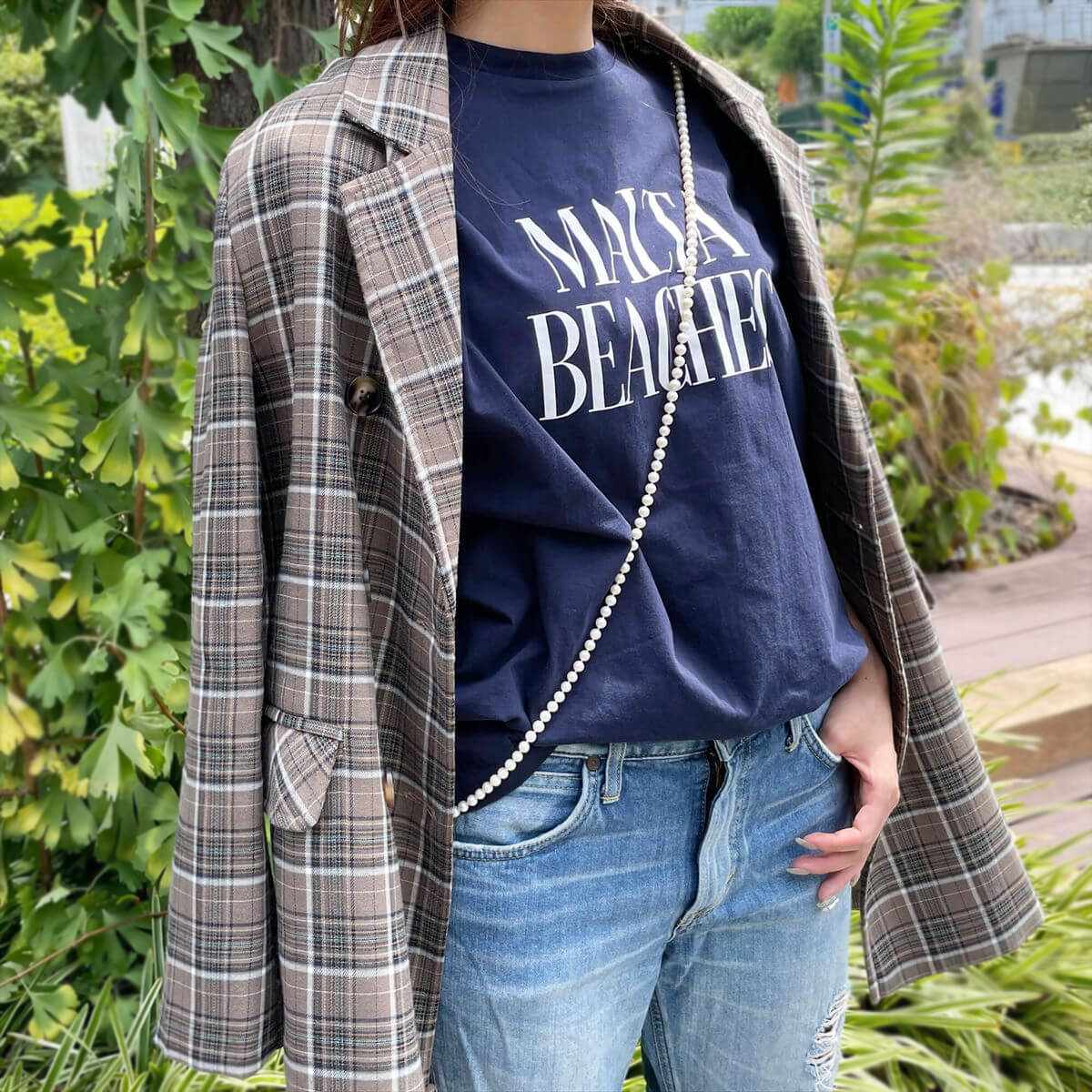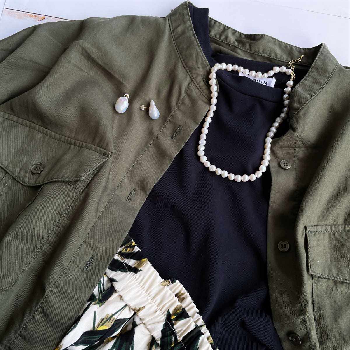 同じTシャツでも、よりカジュアルに柔らかい雰囲気に仕上げたい場合は、バロックパールを合わせて。夏もトレンドでしたが、秋冬も変わらず人気のアイテムです。