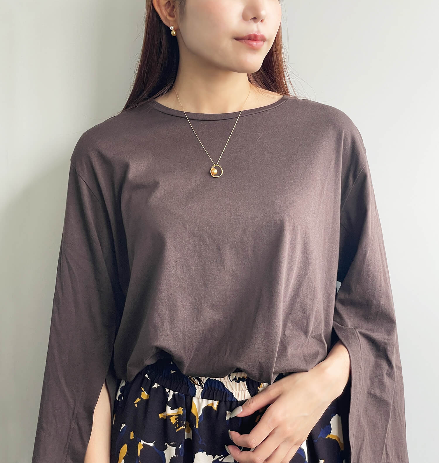 秋色のブラウンTシャツには、ゴールドカラーのパールがマッチ。