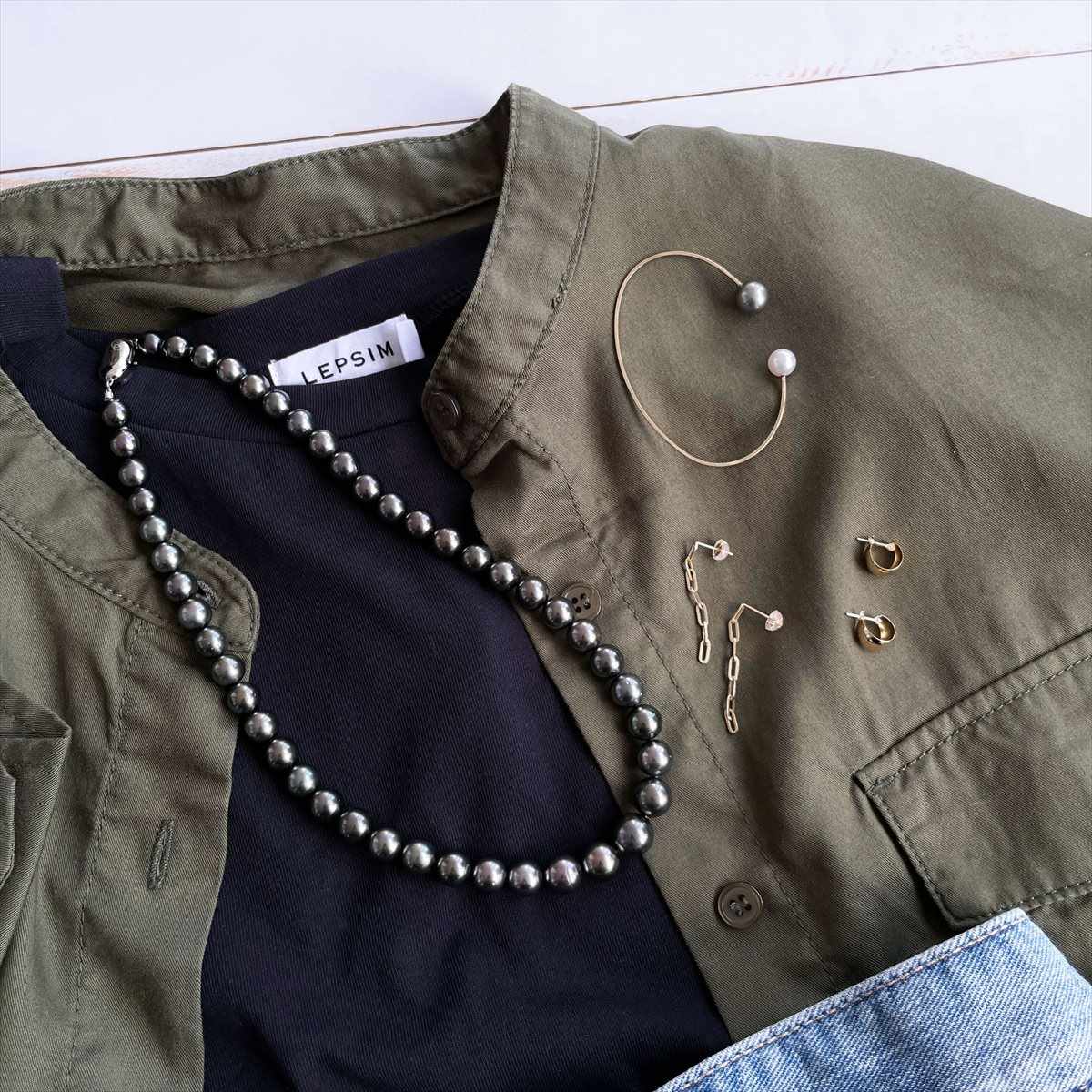 シンプルな黒Tシャツに黒蝶ネックレスを合わせる、大人の余裕を感じさせるスタイル。黒蝶真珠はゴールドジュエリーとも相性◎なので、耳元はボリュームのあるゴールドジュエリーで外して。