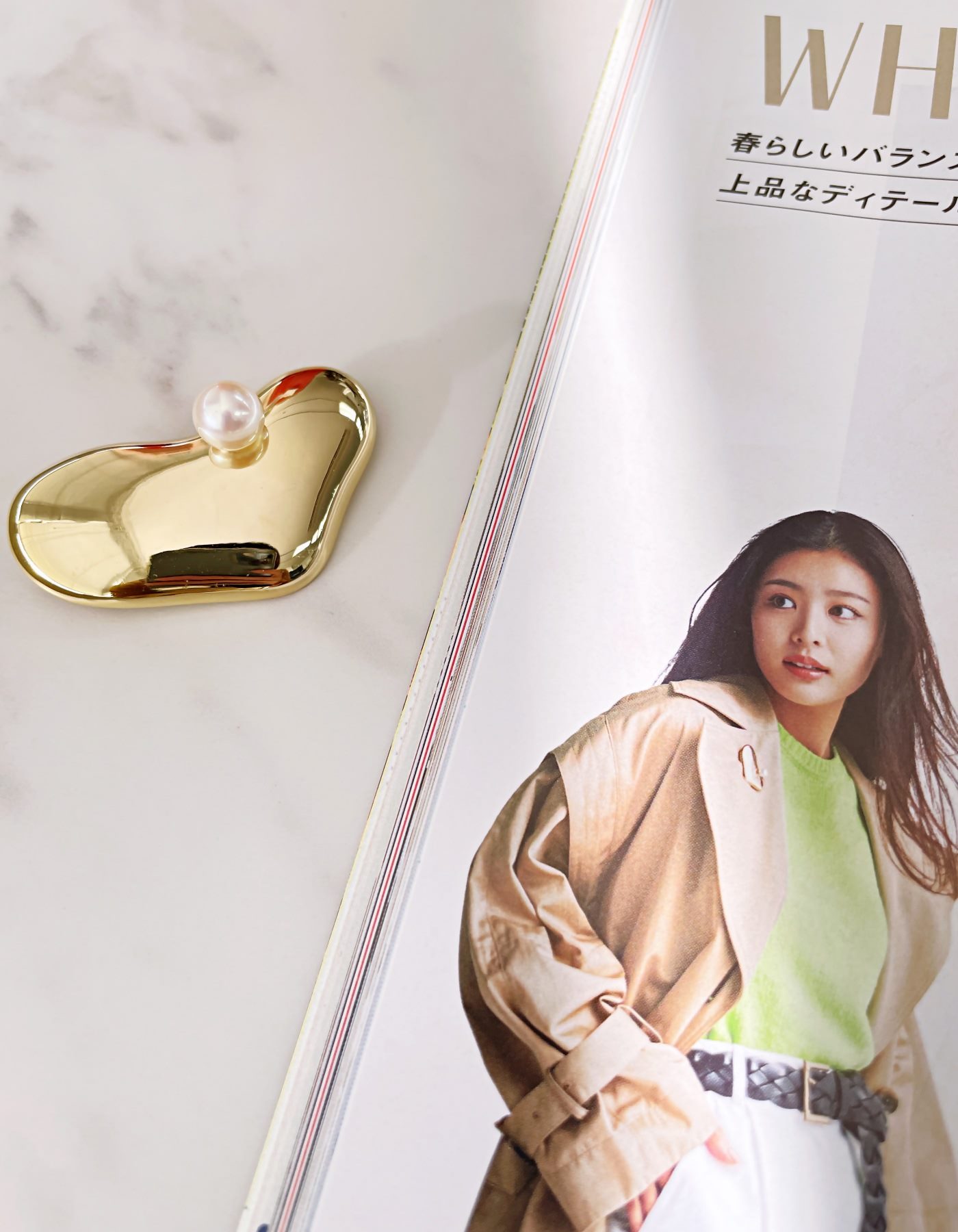 「きれいめシンプル派の春靴100」内(P135)で、ブローチをご着用いただきました。