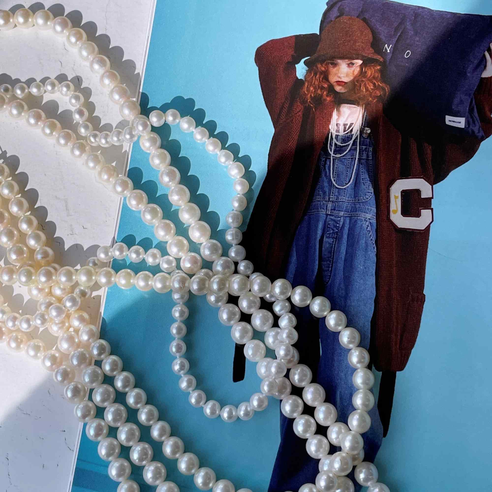 「秋のお洒落はデニムとブラウン。」特集で、コーディネートにパールネックレスが使用されています。
