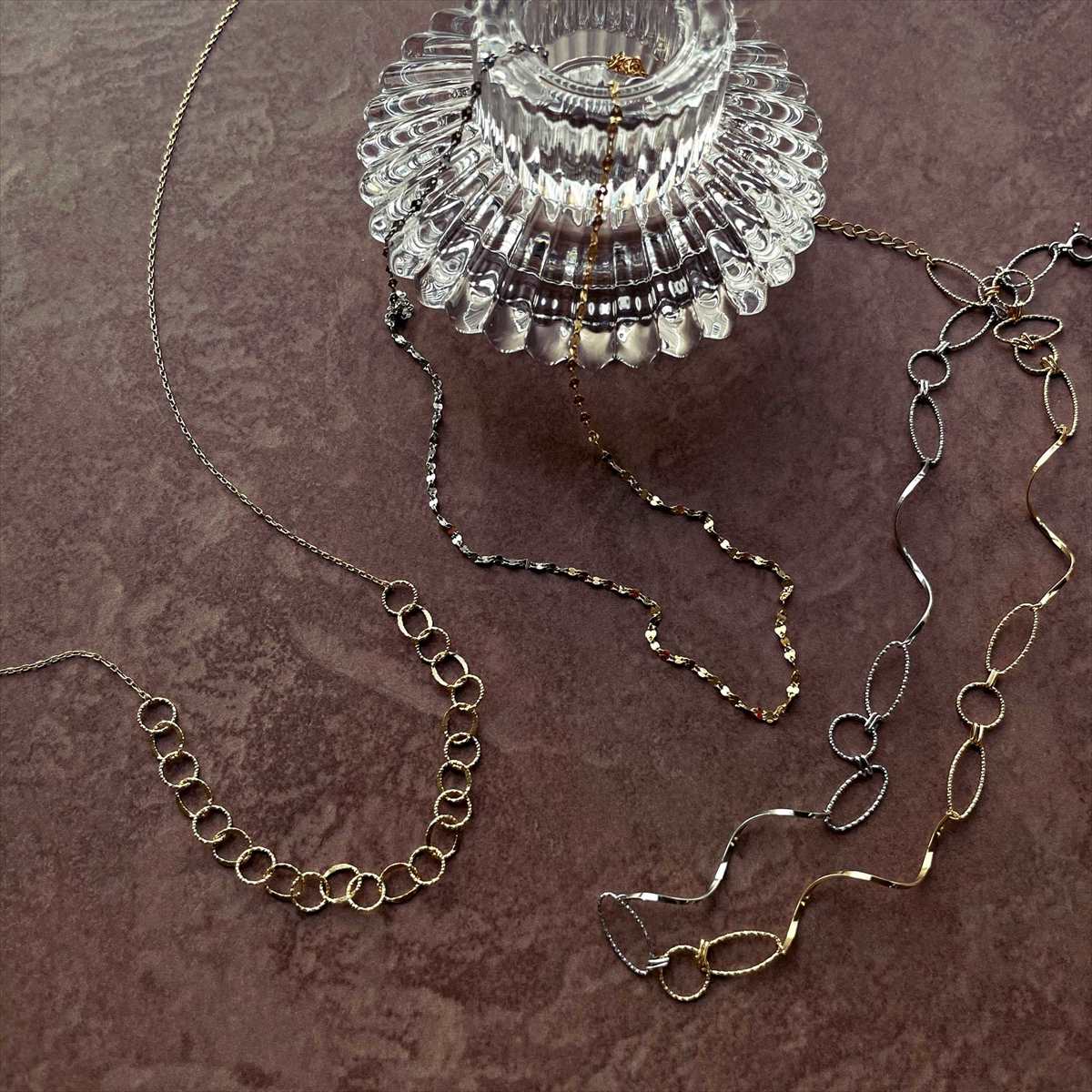 また、人気の高いループ系デザインの新作ゴールドチェーンも必見。