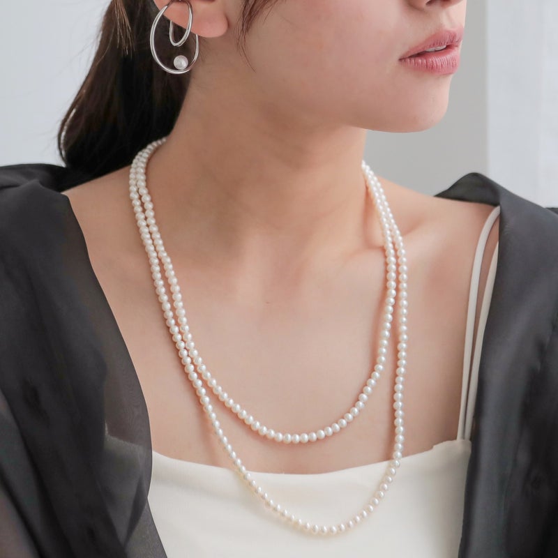 約120cmの長さは、頭からすっぽりかぶれて2重に巻いたり結んだりアレンジも自在。真珠の間に結び目を入れるオールノット加工を施しているので、やわらかい仕上がりになっており、また金具がついていないので金属アレルギーの方も安心してご使用いただけます。