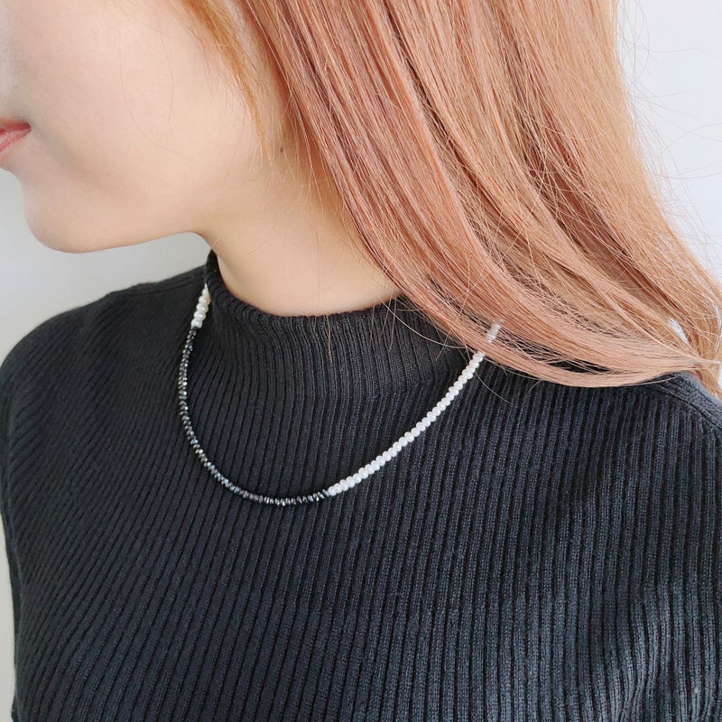 2~4mm台の2種の細さのベビーパールと、クールな輝きを放つブラックスピネルをミックスしたデザインネックレス。アシンメトリーな配置やホワイトパール×ブラックストーンのモノトーンバイカラーで、唯一無二の個性をもつ遊び心のあるジュエリーに仕上げました。