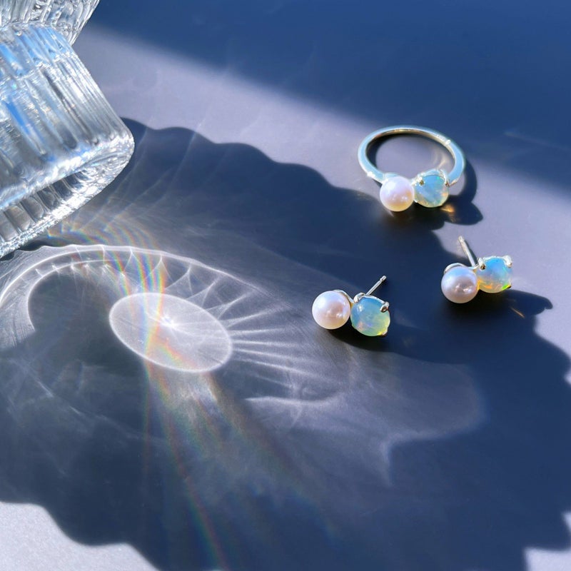 艶やかなあこや真珠と神秘的なオーロラ色が浮かぶオパールが寄り添ったリング。どの角度から見ても美しい虹色の輝きを放つ、自然の生み出した遊色(プレイ・オブ・カラー)をお楽しみください。