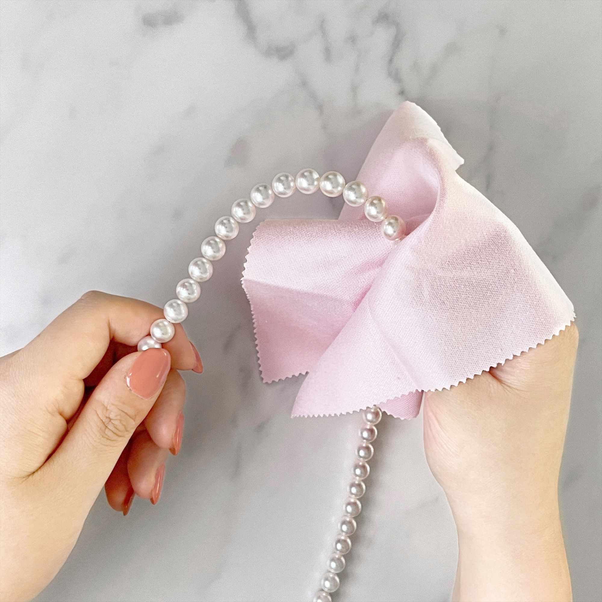 パールネックレスについた汗や汚れを、柔らかく乾いた布で優しく拭き取ってください。